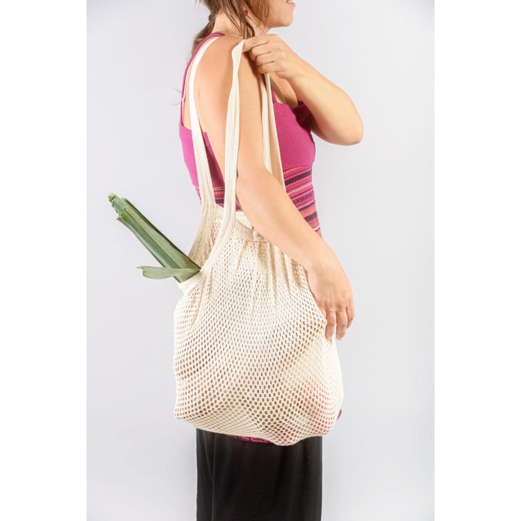Praktická taška přes rameno z husté bavlněné síťoviny. Její tvar vychází z klasické síťovky, ale na rozdíl od ní má mnohem hustší oka, takže se hodí nejen na nákup, ale i na každodenní nošení. Dále o ní prozradíme, že má barvu nebělené bavlny, rozměry 40 x 40 cm, váží 175 g a unese až 15 kg.