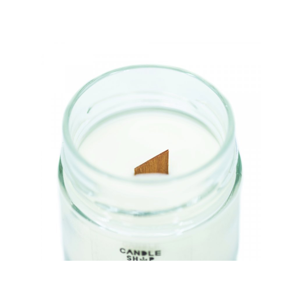 - Přírodní, ručně vyráběná sójová svíčka ve skleněné dóze se dřevěným knotem.