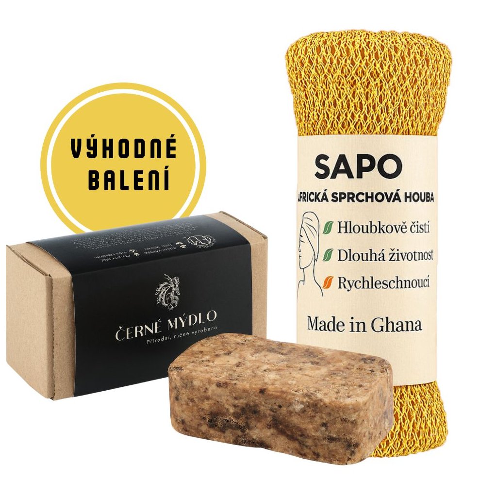 Objevte kombinaci, kterou v Africe používají ženy po generace - SAPO africkou mycí houbu spolu s pravým ghanským černým mýdlem. Společně tvoří výjimečně účinný, přirozený a šetrný způsob péče o celé tělo.